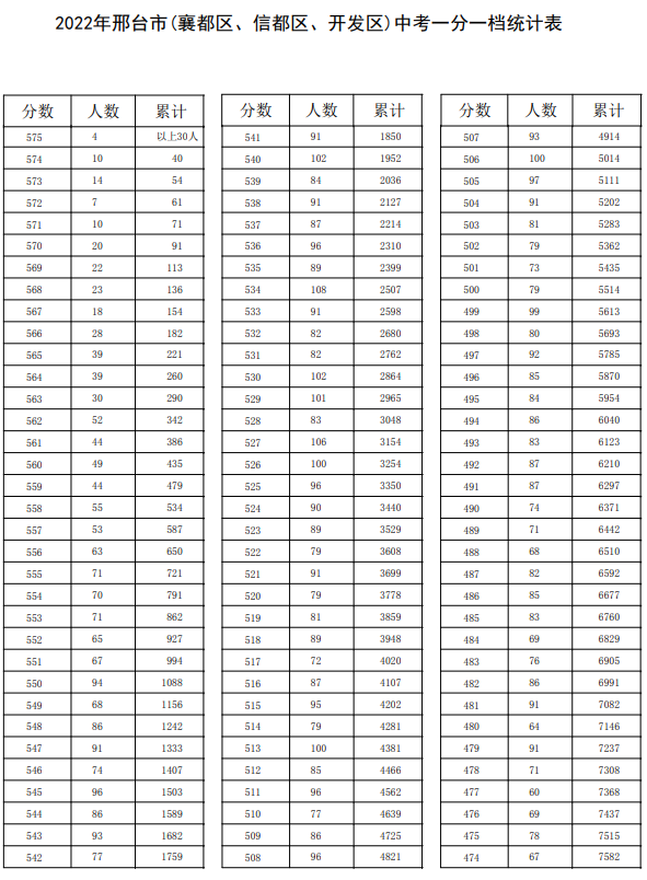 河北邢台中考成绩一分一档公布