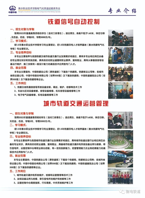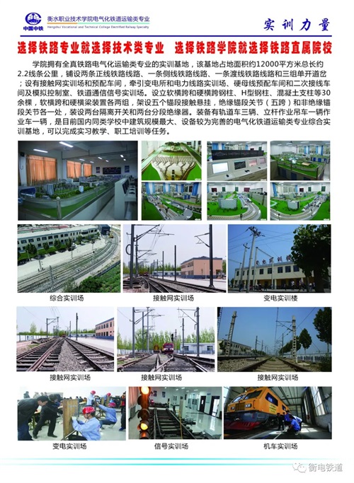 衡水职业技术学院电气化铁道运输类专业是学院与中国中铁深入校企合作、产教融合共建特色专业,打造铁路和轨道交通行业“文化素质+职业技能”的新型大学生人才培养模式,是全国铁路企业举办的电气化铁道运输类专业的国家级重点职业院校,是国家电气化铁道运输类和地铁行业后备力量的主要来源,是中国电气化铁道运输类高技能人才培养基地。学院下设"铁道供电技术”、“铁道信号自动控制"、城市轨道交通运营管理"、“铁道机车运用与维护”专业,具备了全日制大专学生的培养资格,打造铁路及轨道交通行业"文化素质+职业技能"的新型大学生人才培养模式,突出   "应用"  与  "技能"两个特点,在提高大学生文化素质的基础上,运用学校雄厚师资和全真铁路"四电"及运输专业综合实训基地开展“真刀真枪"的实训课程.使培养出来的大学生不是只懂理论知识的花瓶,而是成为I正掌握实际操作技能的优秀者。